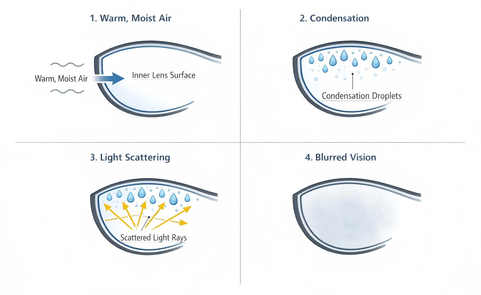 In standard lenses, moisture from the swimmer's face condenses into tiny droplets on the inner lens surface. These droplets scatter incoming light, creating the foggy effect that reduces visibility underwater.